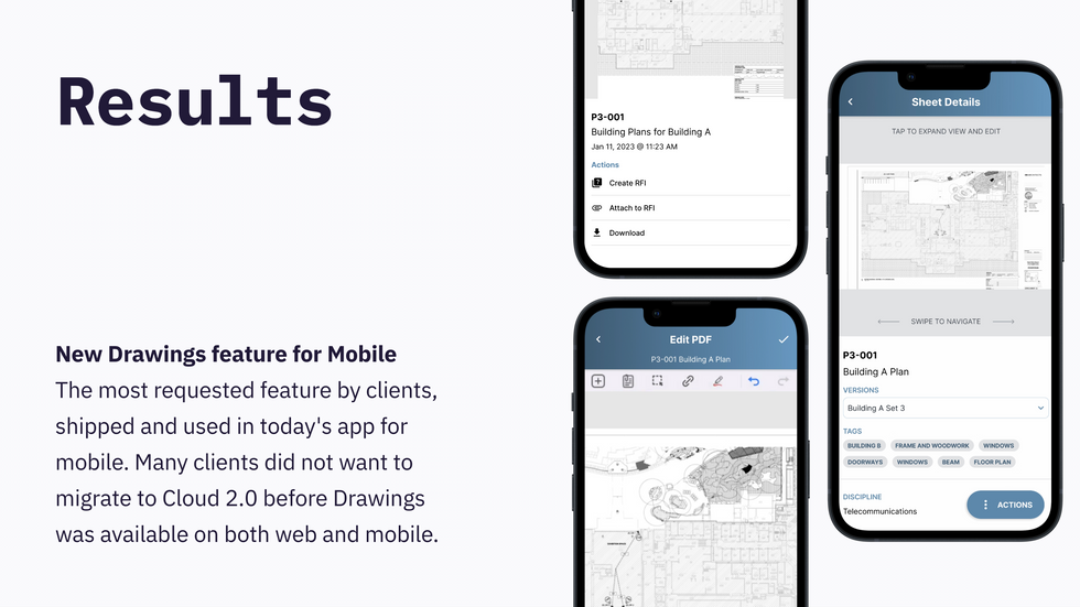 Drawings are a fundamental tool in the construction industry. Subcontractors rely on them to prepare accurate cost estimates, refer to detailed assembly instructions, and coordinate work with other subcontractors. This was the most requested feature by clients in our conversations with them in user research and sales feedback.